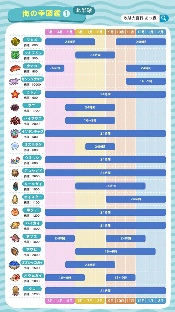 あつ森攻略 攻略大百科 V Twitter 海の幸図鑑画像 7 3の 森アプデ で素潜りができるようになり 海の幸が追加されました 素潜りのお供にカメラロールに保存してお使いください 売値も掲載していますので参考にどうぞ 北半球と南半球で2枚ずつあるのでお